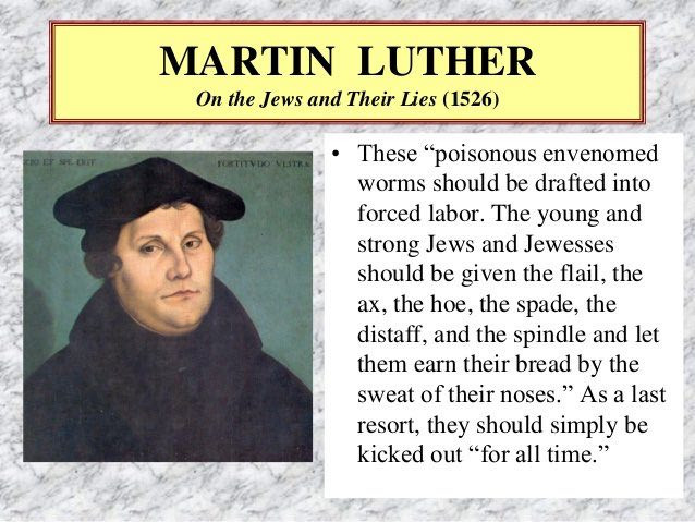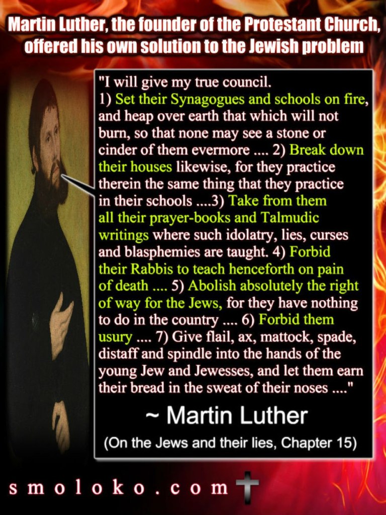 Martin Luther was blunt and to the point backed up with a plethora of Biblical references. And he was spot on with pretty much most everything he said, but where he actually did erred in my researched opinion is by calling the useless eating idolatrous inbred ashkeNAZI yids real joos, when the egotistical mongrels we are talking about were converted in the 8th century and were known as the name stealers. They are not related in the least to the jews in the bible who mostly were slaughtered by the Roman’s in 70ad when they destroyed Jerusalem, as the wailing wall the schizophrenic psychopaths worship and copulate to is actually Fort Antonia which the jews of the day were forbidden to enter due to the debauchery inside. So in the spirit of everything is a LIE and inverted, the anti-semites are simply chosen by satan to deceive as Jesus so told us in John 8:44.