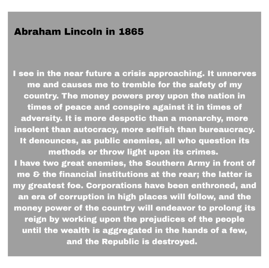 Colonel Dick Taylor was the person Lincoln put in charge of printing 450 million dollars worth of new bills. He stated: “ The government should create, issue, and circulate all the currency and credit needed to satisfy the spending power of the government and the buying power of consumers …The privilege of creating and issuing money is not only the supreme prerogative of Government, but it is the Government’s greatest creative opportunity. By the adoption of these principles, the long felt want for a uniform medium will be satisfied. The taxpayers will be saved immense sums of interest, discounts and exchanges. The financing of all public enterprises, the maintenance of stable government and ordered progress, and the conduct of the Treasury will become matters of practical administration. The people can and will be furnished with a currency as safe as their own government. Money will cease to be the master and become the servant of humanity. Democracy will rise superior to the money power.”