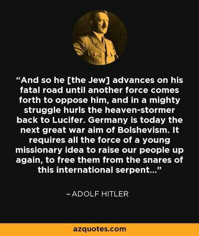 Obviously we had many discussions on Hitler as she knew the holohoax was pure bullshit obviously, as the ashkeNAZI yids use this as a mind control mechanism for the masses which also serves to cover up all the genocides they have done including the 66 million white people the Bolsheviks killed in Russia. The German’s as is obvious we slaughtered in WW2 as they were the good guys, and America was the bad guy like all wars. She told me that Hitler was a bastard Rothschild and sent me a link on this. While this makes sense that all the leaders are part of the bloodline, I read the truth that Hitler spoke and it doesn’t seem right in the least. JFK is part of the blood lines but he had a conscious and went against them also so obviously he was killed too. She told me Hitler did not die after the war and died in Argentina is 1971, and Merkel was his daughter. Obviously Merkel is a mind control drone and like pretty much all women can be programmed accordingly. Hitler certainly could have been part of the blood line but they do go against them also if they morals. Hitler was just such an intelligent man that I can’t imagine him going along with the satanic bankster scum, as all his policies were so humanitarian, and even though he knew the narcissistic ashkeNAZI yids are polluted TRASH, he did not kill them, as he stated sometimes a person is too nice. The situation we are in today is because white people are simply too nice, and the inferiority complex genetically deformed egotistically RETARDED ashkeNAZI yids have no scruples in the least while having severe intellectual deficiencies. The inversion is very apparent to me and becoming more apparent to the masses, but still not the majority.