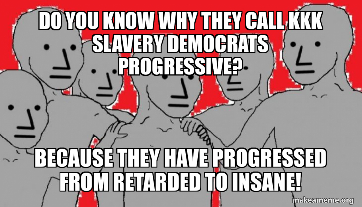 Comatose mentally deranged progressive KKK slavery democrats are especially thrilled since at this point they have progressed completely from stupid to insane! Vegetable Biden has been drooling profusely for days over this! Even 2 bit whore Harris has opened her legs even further in glee which was difficult to open them much more.