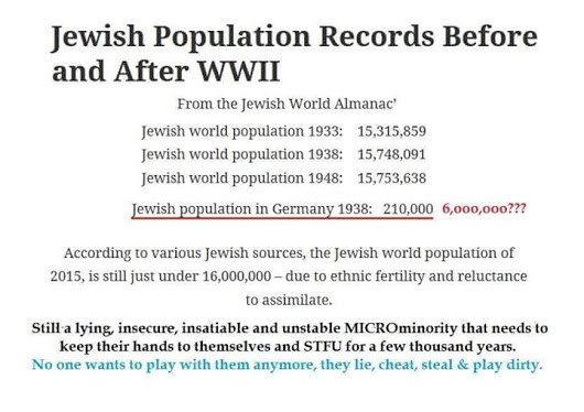 The hallmark of the Brave New World is the ignorance of simple FACTS, and no FACTS are so readily ignored like the population figures of the subversive LYING parasites from 1933 to 1948 proving beyond a shadow of a doubt the holohoax perpetuated by the ugly smelly faulty inbreds is a bunch of TRASH!