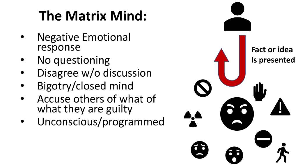 The Matrix is one thing and one thing only and that is the ego. An ego that is bound and recognized so it cannot hide. This is the final stage where you have given up self and put your trust in God. When you look at your own ego in the face on every decision you make, it runs very scared. Refusing to acknowledge your own ego is denying satan exists and that is exactly what he wants. I find it extremely incredible that anyone can deny satan exists with all the bullshit going on nowadays, but most people do. That is because they are in a Trance. Only in this last state of the awakening which is frankly 90 to 100% of the awakening do you truly have a free mind. This last mountain to climb is like comparing an elephant to a mouse with all the truths. While the most important mountain to climb of all, it is a very daunting task indeed. Only the few even make an attempt at this and the bible states this.