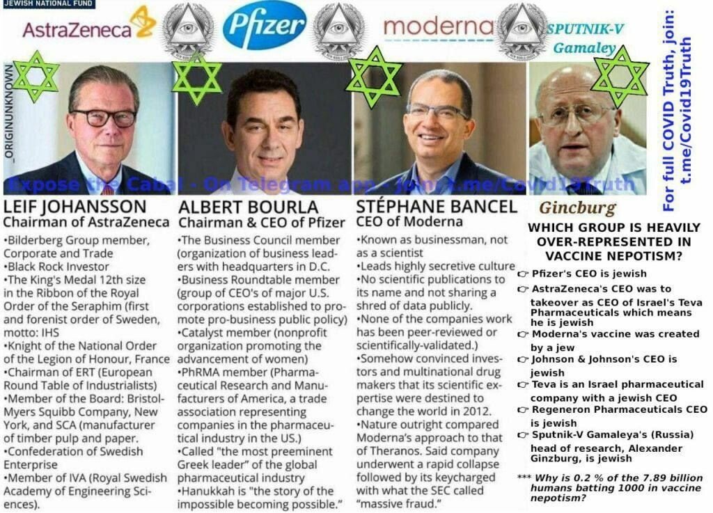 The CEO’s of the Rockefeller death shot are all narcissistically RETARDED subversive LYING parasites. You do not need any other FACTS to figure out the clot shot is pure poison. All these people like illuminati family RFK and (((Simone Gold))) are controlled opposition who do tell the truth but are meant to keep people talking about the elephant in the room, the sub human beasts who falsely call themselves joos!