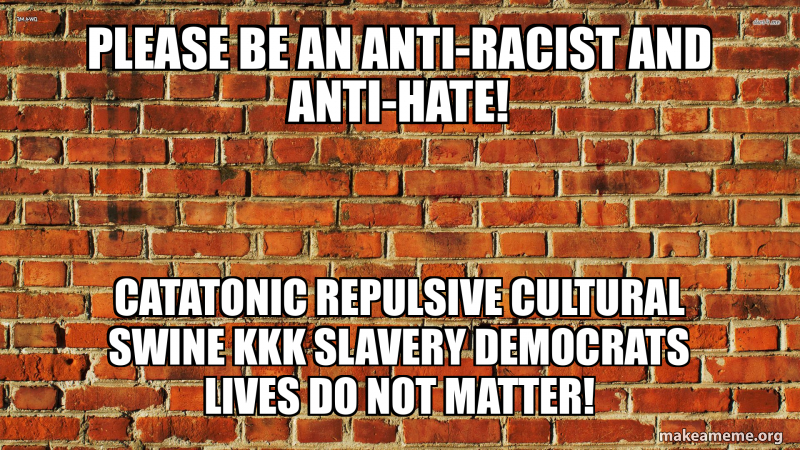 We all must fight the extremist deplorable sycophant HATE and BIGOTRY spewing from mentally deranged putrid vulgar prideful KKK slavery demonrat filth! Anyone who cares about the life of a catatonic KKK slavery demonrat TRASH is a vile RACIST BIGOT. To be an anti-RACIST and anti-HATE it is very important to emphatically state that you are adamantly for the extermination of all selfish slothful KKK slavery demonrat sludge!