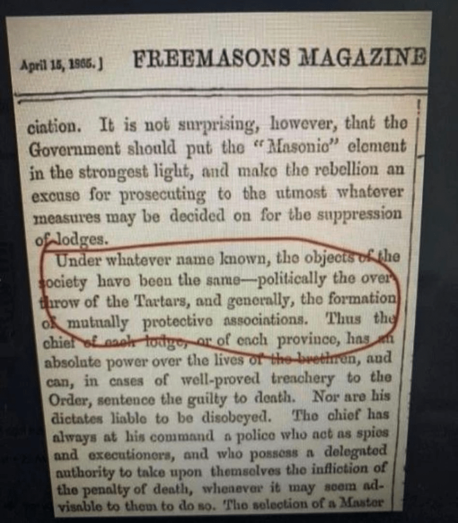 Still in 1865 the mason’s were trying to overthrow the last of the Tartars, yet you most likely have not heard of the Tartars even though at one time they were the biggest country in the world.
