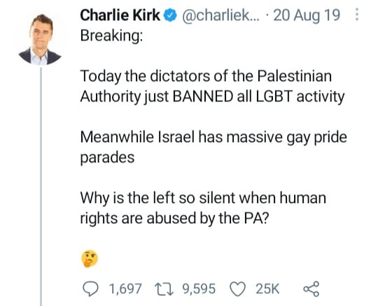 Gosh, a conservative controlled opposition Kirk is supporting the morally depraved prideful BIGOTRY of the synagogue of satan ItsaHELL, and attacking the proper banning of this LGBT nonsense. Gotta protect the pedophiles in IsraHELL right? Pride goes before destruction remember?